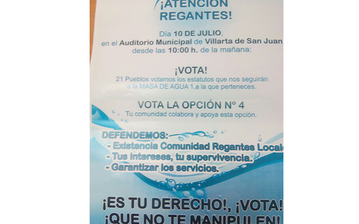 Por su parte, desde las otras comunidades de regantes, lideradas por la de Manzanares, están repartiendo carteles por las distintas localidades en los que se pide el voto para la opción 4 de los estatutos y señalan defender la existencia de las comunidades de regantes locales, los intereses y supervivencia de los regantes y los servicios que actualmente se ofrecen. En la parte final del cartel exclaman que se debe votar y no dejarse manipular.