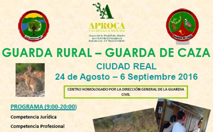 La Asociación de Propietarios Rurales para la Gestión Cinegética y la Conservación del Medio Natural de Castilla-La Mancha (Aproca-CLM) organizará un nuevo curso de guarda rural-guarda de caza, figura que habilita para la profesión en todo el territorio nacional.
