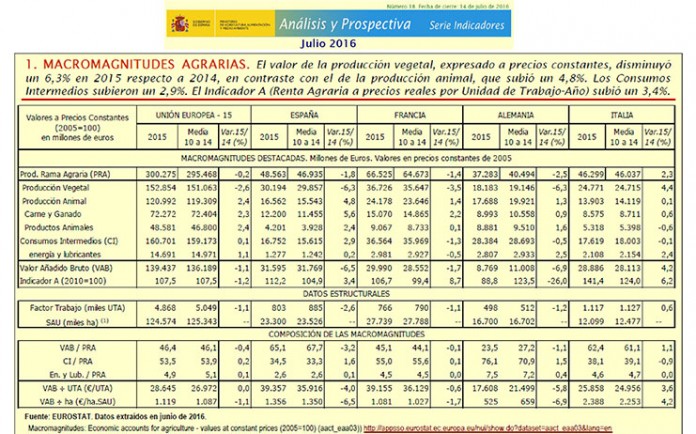 Según el boletín que el Ministerio presenta (a fecha de junio 2016) como resumen de los indicadores del sector agrario, se cifra en 31.595 millones de euros el Valor Añadido Bruto (VAB) generado en 2015, lo que arrojaría una media de 39.357 euros por Unidad de Trabajo año (UTA), a precios constantes. Ello situaría a España muy por encima de la media europea (28.645 €), superando ligeramente a la francesa (39.155), duplicando y más a la alemana (17.608 €), y también por encima de la italiana (25.858 €)