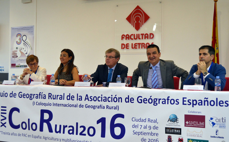 El acto ha contado con la presentación del rector de la Universidad de Castilla-La Mancha (UCLM), Miguel Ángel Collado; la presidenta de la Asociación de Geógrafos españoles (AGE), Carmen Delgado; la alcaldesa de Ciudad Real, Pilar Zamora; y el director del Departamento de Geografía y Ordenación del Territorio, Raúl Ruiz-Pulpón y profesor Titular de Geografía Humana y presidente del Comité Organizador de este Colorural2016.