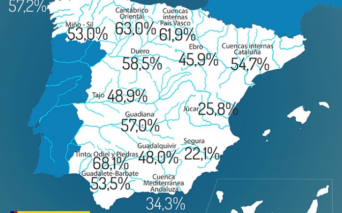 En la actualidad las cuencas hidrográficas cuyas reservas superan ampliamente las del año pasado, en este mismo periodo, son la cuenca del Tajo, con 679 hm3 más, y la cuenca del Duero, con 199 hm3 por encima.