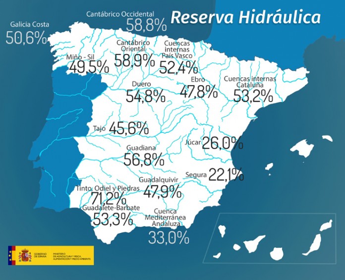 La reserva hidráulica española está al 48,2% de su capacidad total. Los embalses almacenan actualmente 27.002 hectómetros cúbicos (hm³) de agua, lo que representa una disminución del 0,2% de la capacidad total de los embalses (139 hectómetros cúbicos) con respecto a los niveles de la semana anterior.