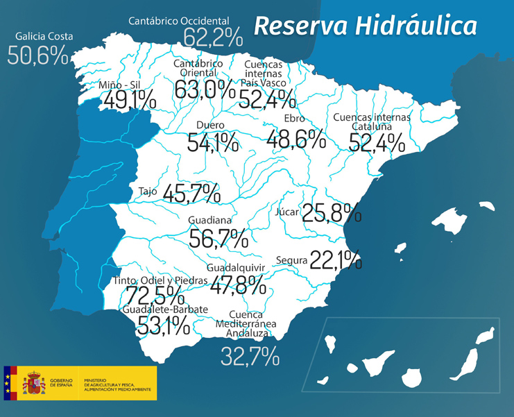 La reserva hidráulica española está al 48,2% de su capacidad total. Los embalses almacenan actualmente 27.009 hectómetros cúbicos (hm³) de agua, lo que representa un ligero aumento de la capacidad total de los embalses, 7 hectómetros cúbicos más con respecto a los niveles de la semana anterior.