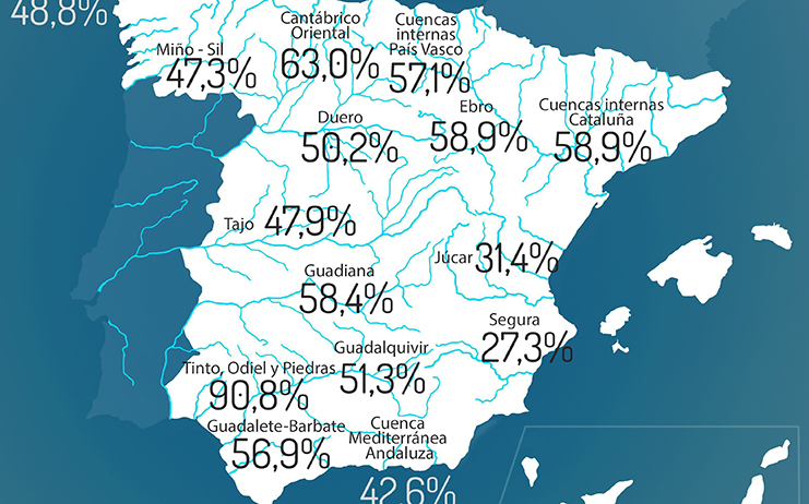 La reserva hidráulica española está al 51,1% de su capacidad total. Los embalses almacenan actualmente 28.598 hectómetros cúbicos (hm³) de agua, lo que representa una disminución del 0,2% de su capacidad total (94 Hm3) con respecto a los niveles de la semana anterior.