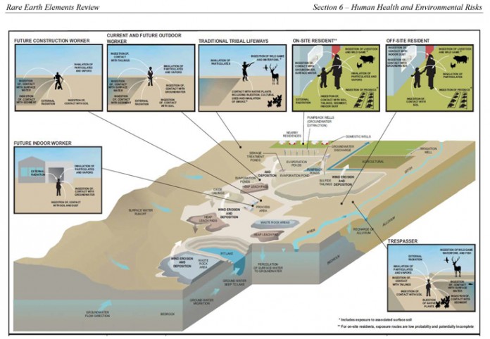 Según informa la Plataforma ‘Sí a la Tierra Viva’ El informe «Tierras Raras: Una revisión de la producción, procesado, reciclaje y cuestiones medioambientales asociadas», publicado por la EPA, alerta entre otros factores de la problemática vinculada a este tipo de minería y sus efectos «para los trabajadores del sitio y los residentes cercanos» por la inhalación de polvos finos (partículas), por ingestión o contacto dérmico con polvos contaminados procedentes de pilas de almacenamiento o de transporte del mineral, un polvo que además «puede ser un irritante, un tóxico, o un carcinógeno» dependiendo del tipo de partículas del que se trate.