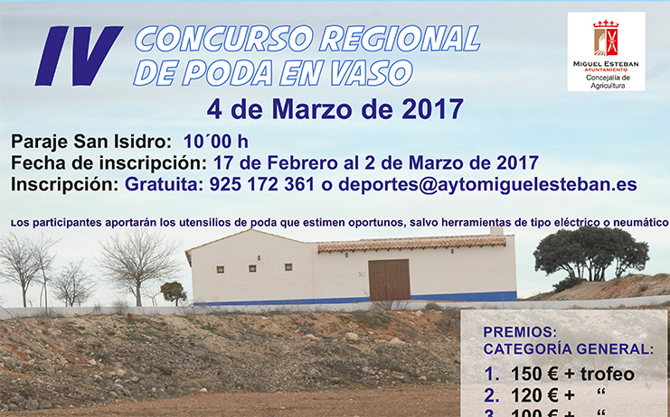 El Ayuntamiento de Miguel Esteban (Toledo), a través de la concejalía de Agricultura, ha organizado el IV Concurso Regional de Poda de Viñedo en Vaso, que se celebrará el próximo 4 de marzo, a partir de las diez de la mañana, en el Paraje de San Isidro.