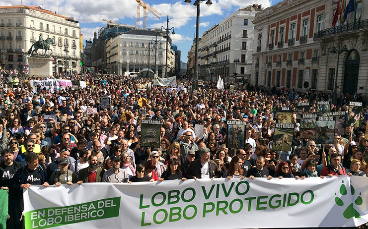 Miles de personas se han manifestado este domingo para exigir a la administración central y autonómicas que detengan la constante matanza de lobos ibéricos. Convocada por Lobo Marley, Equo, Ecologistas en Acción, WWF, European Greens y la Alianza Europea para la conservación del lobo, la marcha ha salido del Ministerio de Agricultura, Pesca, Alimentación y Medio Ambiente para llegar a la Puerta del Sol, donde se ha leído un manifiesto. Con este acto, las organizaciones solicitan la declaración del lobo como especie estrictamente protegida por ley en todo el territorio español y el fin inmediato de su caza y de los controles letales de su población.