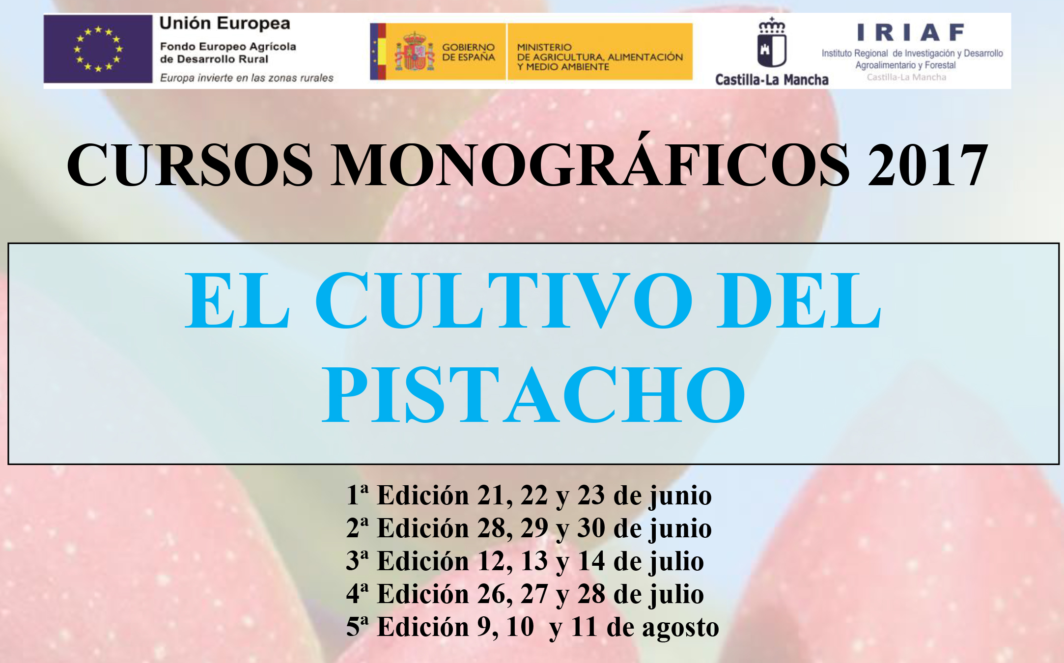 El Centro de Investigación Agroambiental ‘El Chaparrillo’, en Ciudad Real, ha convocado unos cursos monográficos sobre el cultivo del pistacho. Se dividirán en cinco ediciones: dos en el mes de junio, dos en julio y una en agosto, contando cada edición con tres días de curso.