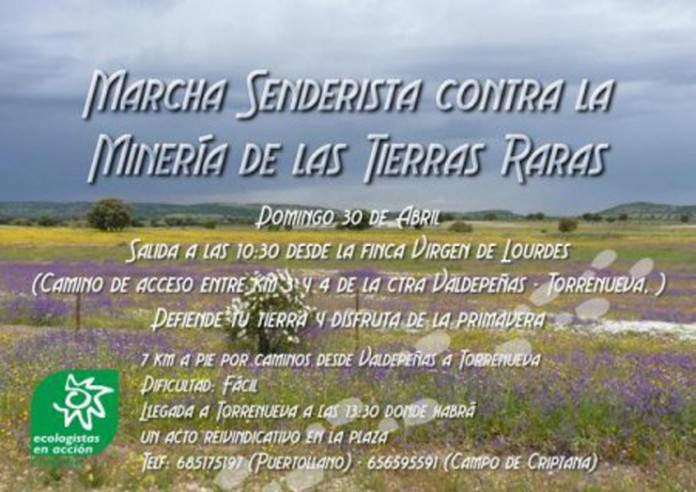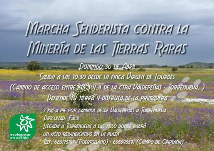 Ecologistas en Acción Ciudad Real ha organizado una marcha senderista contra la minería de las tierras raras y en defensa de un Campo de Montiel vivo, que tendrá lugar este domingo, 30 de abril, a las 10:30 horas- La ruta se iniciará en la finca Virgen de Lourdes (en el camino de acceso entre el kilómetro 3 y 4 de la Ctra. Valdepeñas-Torrenueva) y finalizará en la Plaza de Torrenueva, donde está prevista la llegada alrededor de las 13:30 horas. Allí se hará una concentración y un acto público.