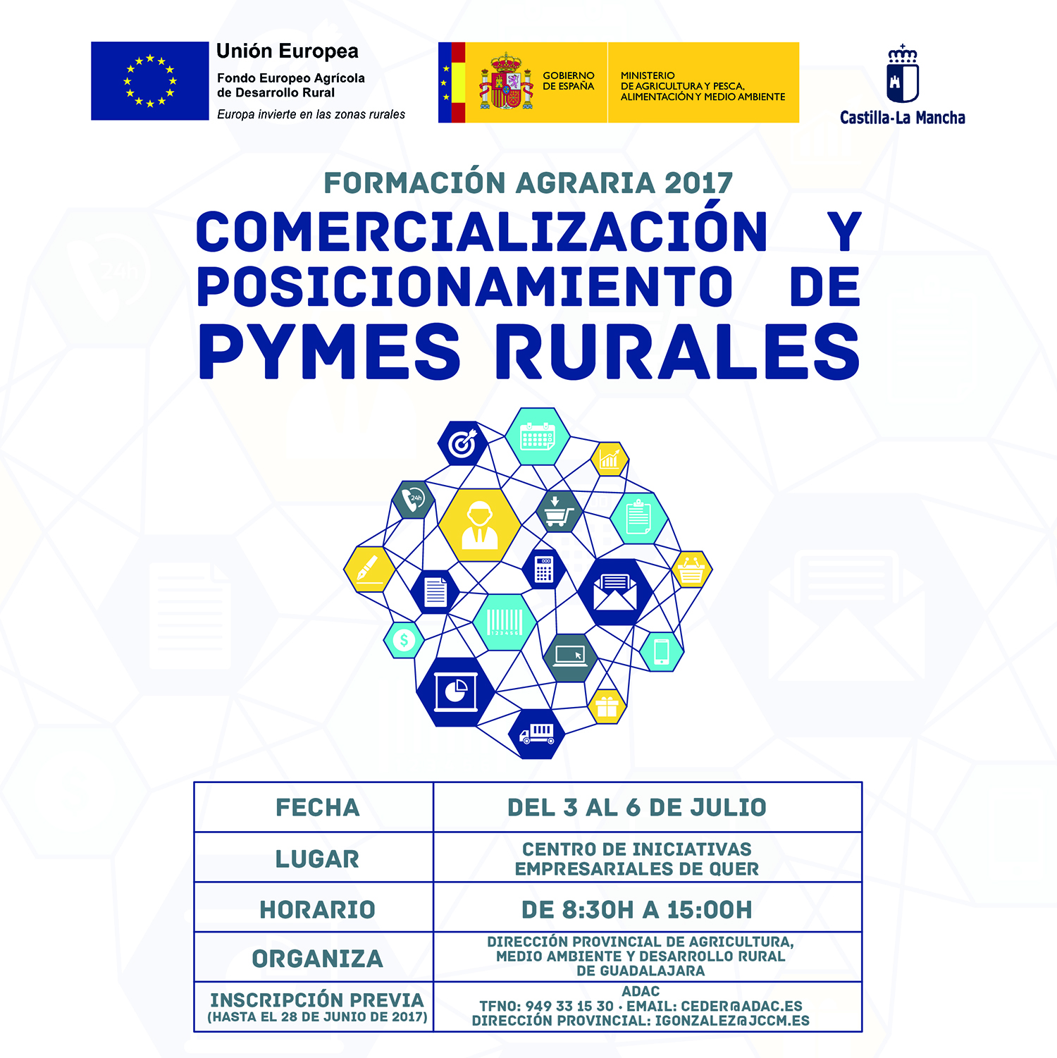 Por otra parte, la Dirección Provincial de Agricultura, Medio Ambiente y Desarrollo Rural de Guadalajara ha programado, en colaboración con ADAC, el Curso sobre «Posicionamiento y comercialización de las Pymes rurales», que se llevará a cabo entre los días 3 y 6 de julio de 2017, en horario de 08:30 a 15 horas.
