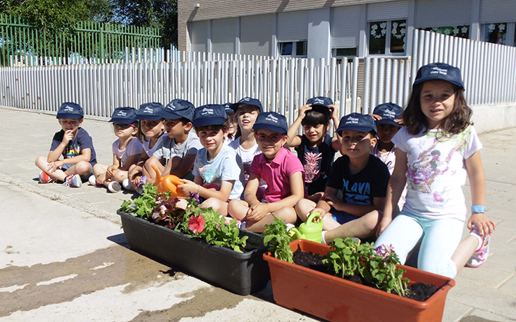 Los cubos, palas, regaderas, tierra y demás aparejos que los técnicos de Taxus pusieron a disposición de los alumnos y alumnas de educación infantil les permitieron hacer una plantación de plantas de flor en jardineras para que, una vez realizada, se quedara en su colegio.
