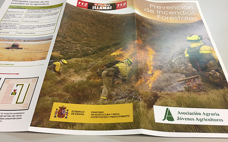 Bajo el lema ‘Si ves fuego ¡Llama!’, ASAJA, en colaboración con el Ministerio de Agricultura, ha lanzado una campaña de prevención de incendios forestales, que pretende llegar especialmente a los agricultores y ganaderos, aportando una serie de recomendaciones para evitar incendios y un teléfono donde llamar, el 112. Los dípticos se repartirán por todas las provincias de España.