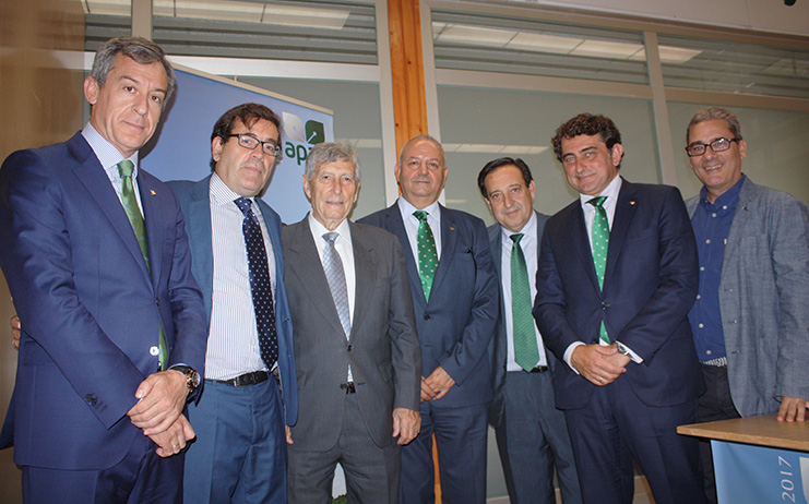 Los responsables de Caja Rural Castilla-La Mancha saludaron a Cabanas, al presidente nacional de ASAJA, Pedro Barato; al secretario general de ASAJA Castilla-La Mancha, José María Fresneda; y al presidente y el secretario general de CEOE Guadalajara, Agustín de Grandes y Javier Arriola, respectivamente, entre otros.