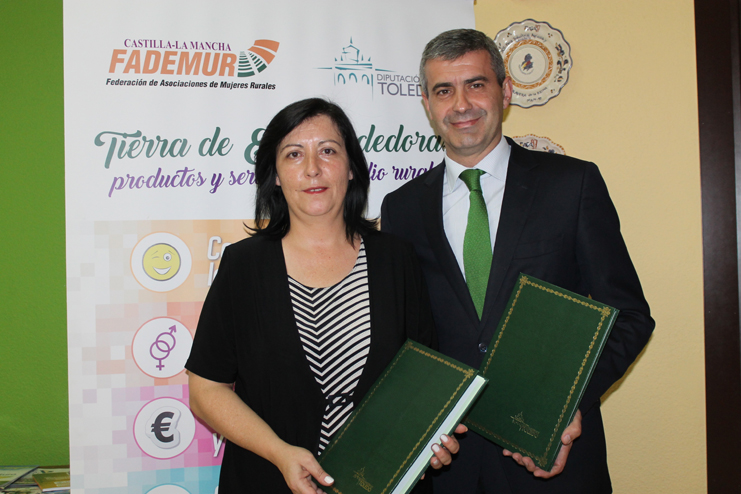 El presidente de la Diputación de Toledo, Álvaro Gutiérrez, y la presidenta de la Federación de Asociaciones de Mujeres Rurales, FADEMUR de Castilla-La Mancha, Elisa Fernández, han firmado el convenio de colaboración que permitirá que el proyecto “Tierra de emprendedoras” vuelva a llevar este año 2017 por la provincia de Toledo las ferias que muestran las iniciativas empresariales puestas en marcha por mujeres del mundo rural toledano.