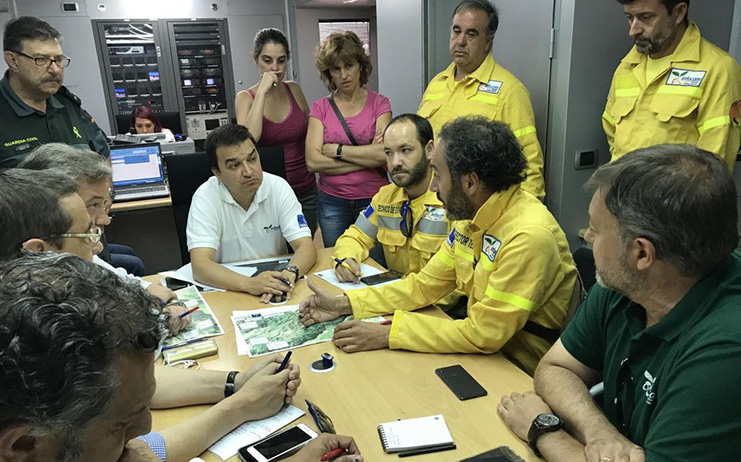 Desde el Puesto de Mando Avanzado, instalado junto a la ermita de San Bartolomé y tras la reunión de coordinación del Servicio Extinción Incendios Forestales de Castilla-La Mancha, INFOCAM, Martínez Arroyo ha explicado que la estrategia se centra ahora en avanzar más al este la línea de control, “para garantizar la seguridad del dispositivo”.