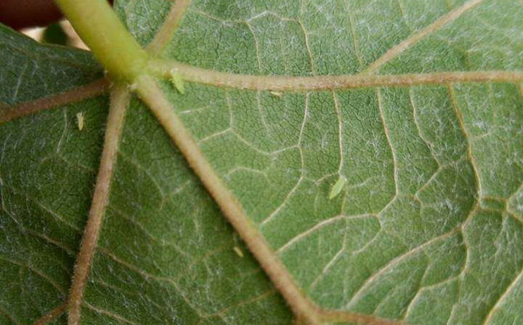 Sus daños directos se limitan a las hojas. Con su aparato chupador ataca principalmente los nervios de las hojas, provocando desecaciones por los bordes, que están limitadas por ribetes de color rojo en las variedades tintas y amarillo en las blancas.