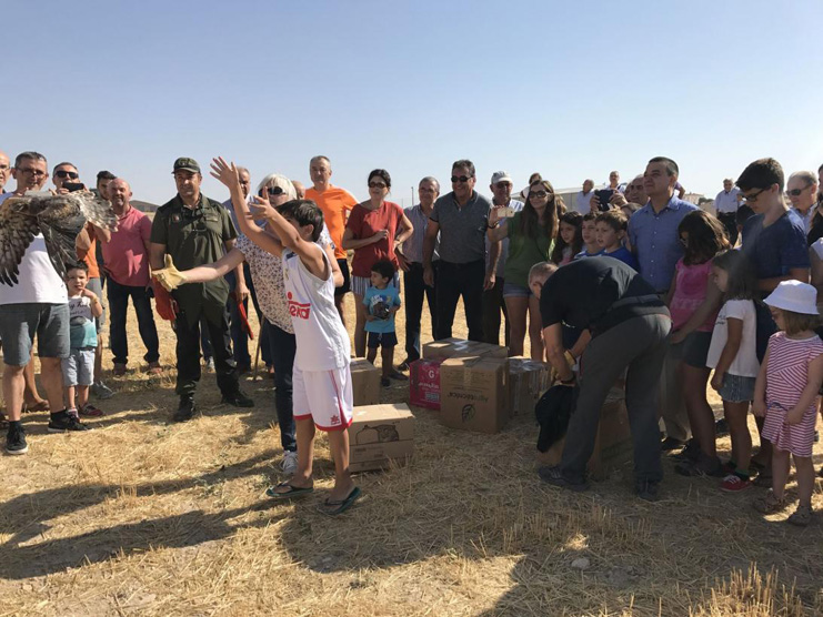El consejero de Agricultura, Medio Ambiente y Desarrollo Rural, Francisco Martínez Arroyo, ha asistido al momento en el que los agentes medioambientales y técnicos han liberado 11 aguiluchos cenizos y 6 aguiluchos laguneros en Vara de Rey, acompañados por la alcaldesa, Anunciación Martínez Serrano; el delegado de la Junta en la provincia, Ángel Tomás Godoy, agricultores y niños del municipio.