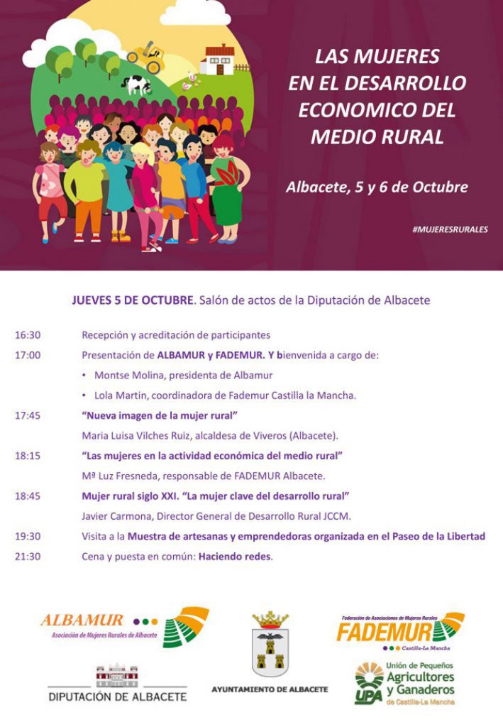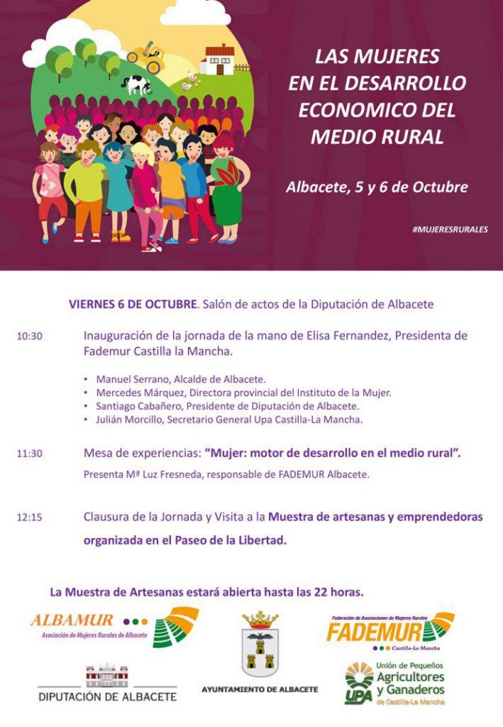 El viernes día 6 de octubre, Elisa Fernández, presidenta de FADEMUR Castilla-La Mancha, será la encargada de la inauguración, a la que asistirán el alcalde de Albacete, Manuel Serrano; Mercedes Márquez, directora provincial del Instituto de la Mujer; Santiago Cabañero, presidente de Diputación de Albacete y Julián Morcillo, Secretario General UPA Castilla-La Mancha.