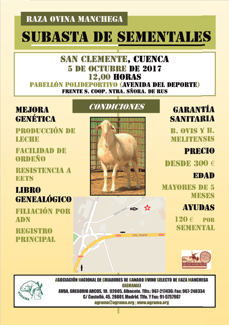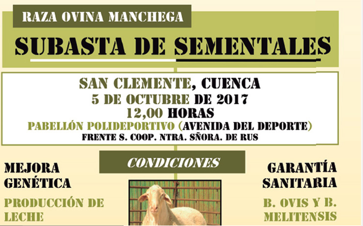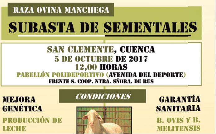 La próxima Subasta de Sementales de raza ovina Manchega organizada por la Asociación Nacional de Criadores de Ganado Ovino Selecto de Raza Manchega (AGRAMA) tiene lugar este jueves, a las 12 horas, en las instalaciones del Pabellón de Polideportivo de San Clemente (Cuenca).