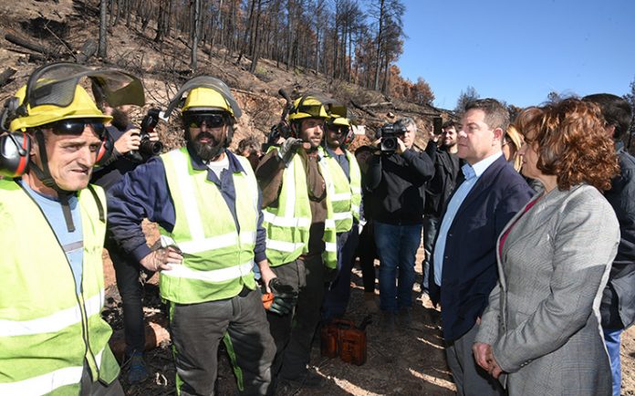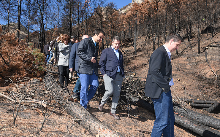 El presidente de Castilla-La Mancha, Emiliano García-Page, ha viajado hasta la pedanía de Las Quebradas, la zona cero del incendio de Yeste (Albacete), acompañado del consejero de Agricultura, Medio Ambiente y Desarrollo Rural, Francisco Martínez Arroyo, para comprobar in situ los trabajos del Plan de Recuperación Medioambiental de la superficie afectada, “que se ha iniciado con las reparaciones de los caminos dañados en la extinción del incendio, la recogida de madera para aprovechamiento de biomasa y para la construcción de diques de contención para evitar la erosión del suelo cuando lleguen las lluvias”, según ha indicado el consejero.