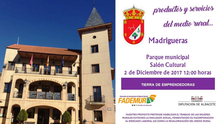 La Federación de Asociaciones de Mujeres Rurales, FADEMUR de Castilla-La Mancha, ha organizado, en colaboración con la Diputación de Albacete, la Muestra de Emprendedoras que se instalará el sábado 2 de diciembre en la localidad de Madrigueras. Esta muestra se enmarca dentro del proyecto “Fomento del Autoempleo de la Mujer Rural, Tierra de Emprendedoras” promovido por FADEMUR Castilla-La Mancha.