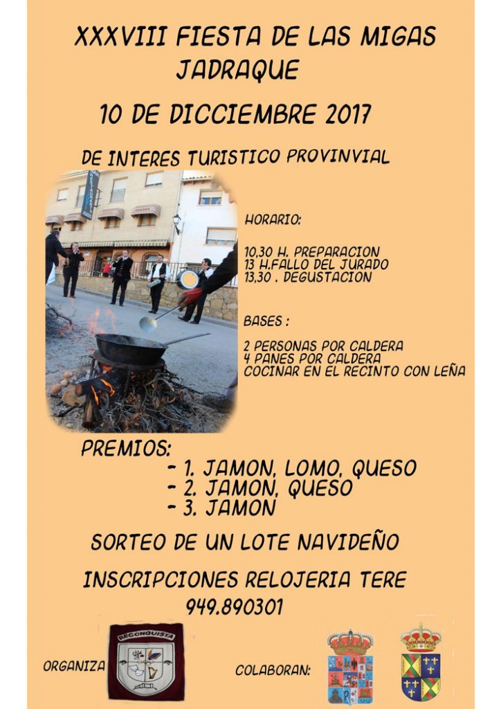 El próximo día 10 de Diciembre, Domingo, se celebra en Jadraque la XXXVIII edición de su popular Fiesta de las Migas, declarada de Interés Turístico Provincial.