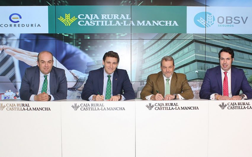 El convenio fue rubricado por el director general de Caja Rural Castilla-La Mancha, Víctor Manuel Martín López, y por el presidente de E-Correduría, Ángel Viñas i Aliau, en presencia del director general de esta firma, Jorge García González, y del director de la División de Negocio de Caja Rural Castilla-La Mancha, Enrique Muñoz Sánchez.
