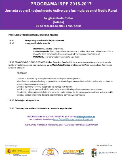 La Federación de Asociaciones de Mujeres Rurales, FADEMUR de Castilla-La Mancha, ha organizado varias jornadas de sensibilización dirigidas a mujeres del entorno rural donde se tratarán importantes cuestiones de salud femenina. En concreto, el 16 de febrero en Villanueva de los Infantes, Ciudad Real, y el 21 de febrero en La Iglesuela del Tiétar, Toledo, donde se hablará sobre envejecimiento activo y saludable de las mujeres en cuestiones como la rehabilitación y prevención de Problemas de Suelo Pélvico.