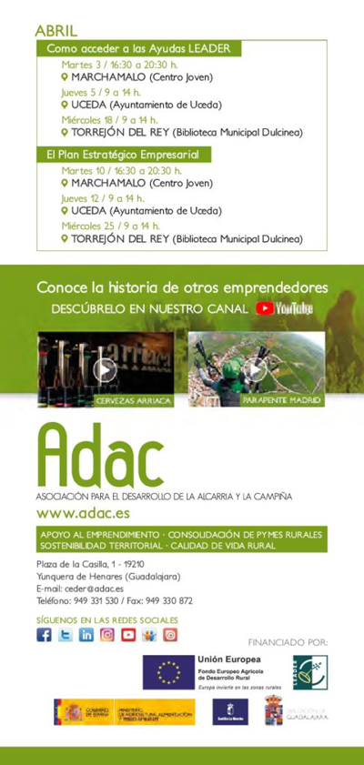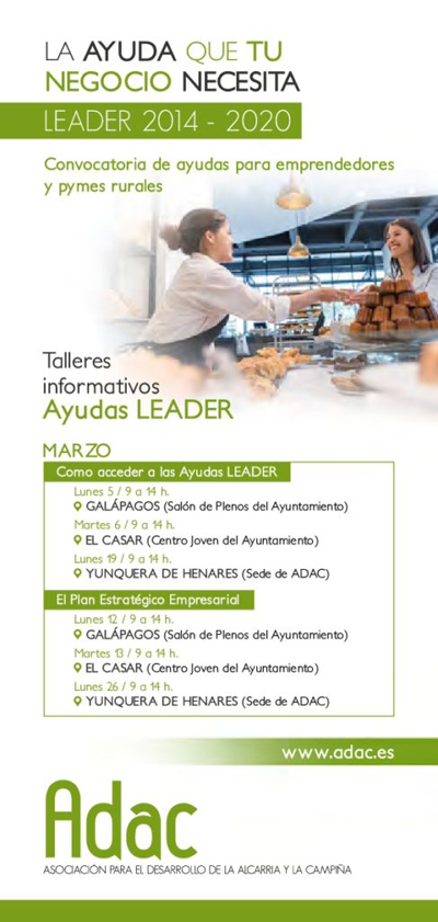 La Asociación para el Desarrollo de la Alcarria y la Campiña (ADAC) ha programado doce nuevos talleres informativos, dentro de la campaña de dinamización de las ayudas LEADER “La ayuda que tu negocio necesita: LEADER 2014 – 2020”. Los talleres se desarrollarán en los meses de marzo y abril en las localidades de Galápagos, El Casar, Yunquera de Henares, Marchamalo, Uceda y Torrejón del Rey.