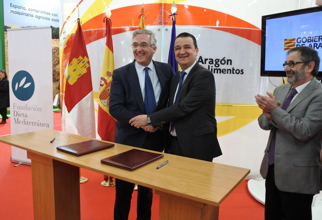 El consejero de Agricultura, Medio Ambiente y Desarrollo Rural, Francisco Martínez Arroyo y el consejero de Agricultura de Aragón, Joaquín Olona, han firmado hoy en la 40ª Feria Internacional de Maquinaria Agrícola (FIMA) en Zaragoza, en nombre de la Fundación Dieta Mediterránea, la incorporación de la Comunidad Autónoma de Aragón a dicha Fundación. De esta manera, son ya cuatro las regiones que participan en la promoción de la dieta mediterránea: Castilla-La Mancha, Cataluña, Cantabria y Aragón.