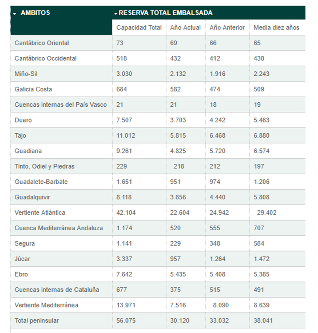 La reserva hidráulica española está al 53,7 por ciento de su capacidad total. Los embalses almacenan actualmente 30.120 hectómetros cúbicos (hm³) de agua, aumentando en la última semana en 3.813 hectómetros cúbicos (el 6,8 por ciento de la capacidad total actual de los embalses)