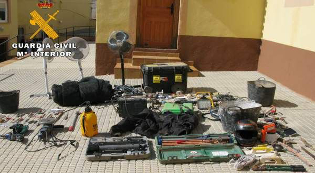Igualmente se consiguió recuperar numerosa herramienta y otro tipo de enseres, localizados en el interior de una caravana de dicha propiedad y cuyo origen se encuentra en fase de investigación. Los efectos recuperados, todavía sin identificar por sus legítimos propietarios, se encuentran depositados en el acuartelamiento de la Guardia Civil de Elche de la Sierra, por si alguna persona que hubiera sido víctima de algún robo en las zonas afectadas pudiera identificar alguno de ellos, debiendo aportar copia de la denuncia.