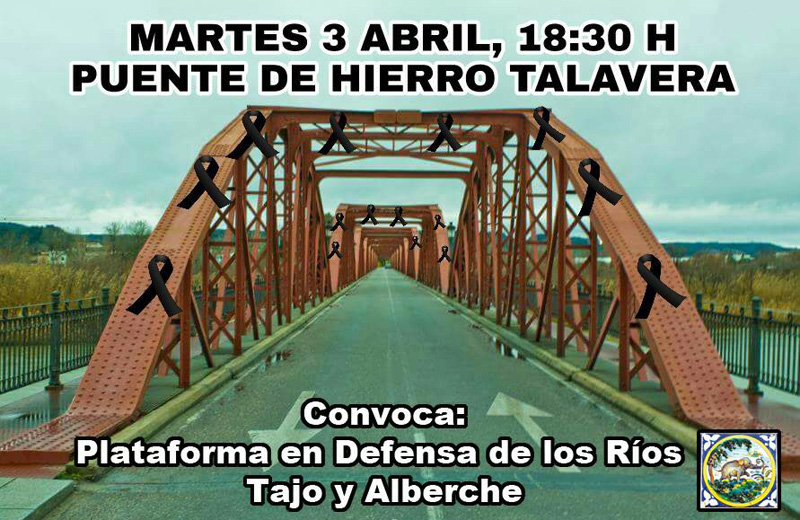 La Plataforma en defensa de los ríos Tajo y Alberche ha convocado a sus miembros y vecinos de Talavera y comarca, a las 18.30 h de hoy martes 3 de abril a un acto simbólico de protesta en la entrada al Puente de Hierro de Talavera de la Reina, en el inicio de la avenida Real Fábrica de Seda.
