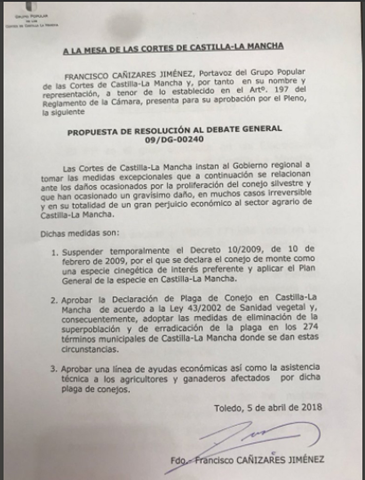 En las Cortes Regionales donde esta mañana se celebraba un pleno que, entre otros puntos incluía en el orden del día un debate general sobre el sector agrario, el grupo parlamentario popular ha presentado una propuesta de resolución para la adopción de tres medidas urgentes: La suspensión temporal del Decreto de 2009 por el que se declara al conejo de monte como una especie cinegética de interés preferente y que se aplique el Plan General de la especie en Castilla-La Mancha; aprobar la declaración de plaga de conejo en la región y con ello aplicar las medidas de eliminación de la superpoblación de esta especie y de erradicación de la plaga y aprobar una línea de ayudas económicas, así como la asistencia técnica a los agricultores y ganaderos afectados por dicha plaga de conejos.