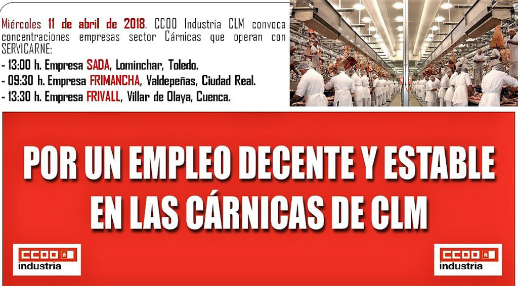 CCOO-Industria CLM “intensifica su ofensiva contra la creciente presencia en las industrias cárnicas de falsas cooperativas, falsos autónomos y trabajadores de ETT”, con la convocatoria de concentraciones de delegados y delegadas ante tres grandes empresas del sector radicadas en la región: SADA (Lominchar, Toledo)), Frimancha (Valdepeñas, Ciudad Real) y Frivall (Villar de Olaya, Cuenca).