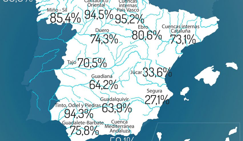 La reserva hidráulica española está al 68,6 por ciento de su capacidad total. Los embalses almacenan actualmente 38.461 hectómetros cúbicos (hm³) de agua, aumentando en la última semana en 1.833 hectómetros cúbicos (el 3,3 por ciento de la capacidad total actual de los embalses)