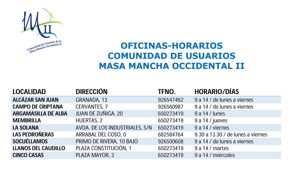 La Comunidad de Usuarios de Aguas Subterráneas de la Masa Mancha Occidental II está configurando su red de oficinas de atención al regante en las provincias de Ciudad Real, Cuenca y Albacete para poder ofrecer un servicio cercano a los cerca de 10.000 regantes con los que cuenta.