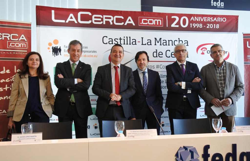 En el VI Foro Castilla-La Mancha, presentado por Manuel Lozano Serna, director del Grupo Multimedia de Comunicación ‘La Cerca’ han estado presentes, además del consejero de Agricultura, Medio Ambiente y Desarrollo Rural; el presidente de la Confederación de Empresarios de Albacete, Artemio Pérez Alfaro; el presidente de Eurocaja Rural, Javier López Martín; la vicedecana de la Facultad de Ciencias Económicas y Empresariales de la UCLM en Albacete, Ángela Triguero Cano; y gerente de Champinter, Abdón Catalán.