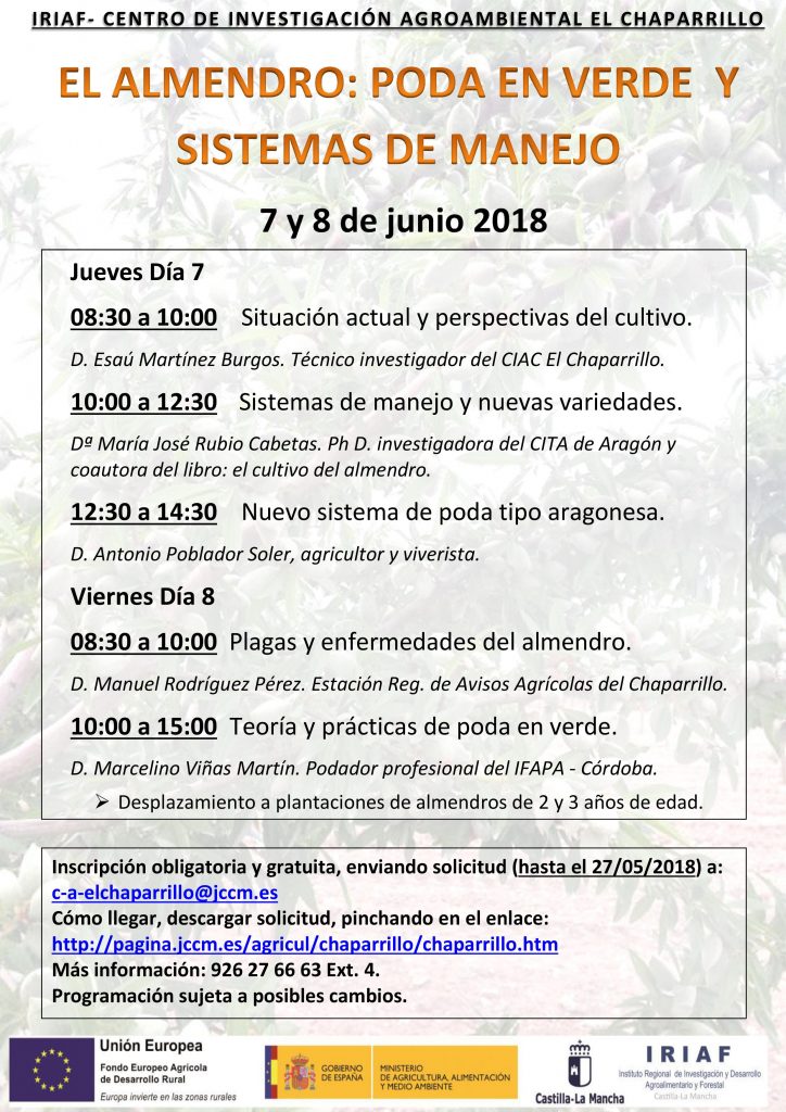 El Centro de Investigación Agroambiental ‘El Chaparrillo’ va a celebrar unas jornadas sobre sistemas de cultivo, plagas y poda en verde del almendro, que tendrán lugar los días 7 y 8 de junio, en sus instalaciones de Ciudad Real.