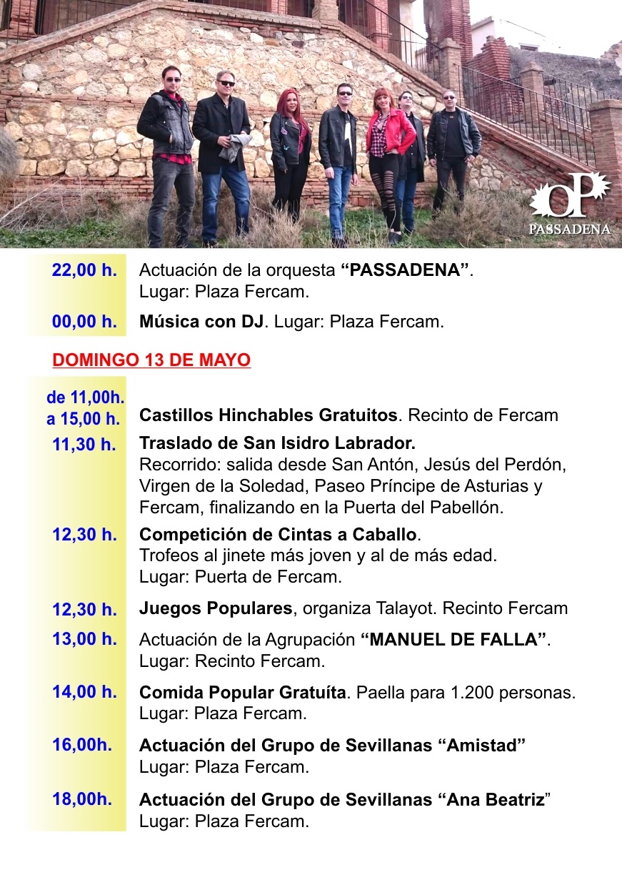 El programa sigue la línea de años anteriores y tendrá su día fuerte en la jornada del domingo previo al día de San Isidro Labrador. Los actos comenzarán el sábado 12 con actividades del programa juvenil Empu-G en el recinto ferial de 8 de la tarde a 11 de la noche, entre ellas un torneo de fútbol 3×3 con categorías de 12 a 15 y de 16 a 22 años, y premios en vales canjeables.