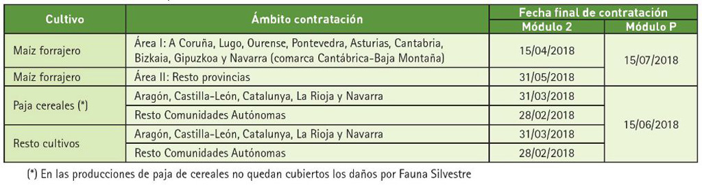 Para algunos cultivos y determinadas modalidades los plazos de contratación están finalizados. No obstante, todavía está abierto para el Módulo P y para el maíz forrajero en el Módulo 2 para la mayor parte de las provincias. En el caso de Castilla-La Mancha, se puede contratar hasta: