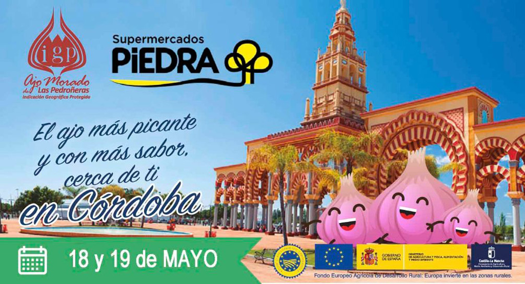 La Indicación Geográfica Protegida (IGP) Ajo Morado de Las Pedroñeras desarrollará los días 18 y 19 de mayo nuevas promociones, en esta ocasión en ocho establecimientos de Supermercados Piedra, cadena muy asentada especialmente en Córdoba y provincia. La capital cordobesa se suma así a otras como León, Vitoria, Bilbao y poblaciones de Vizcaya, Zaragoza, Santa Cruz de Tenerife y Las Palmas de Gran Canaria, etc. donde el Ajo Morado de Las Pedroñeras ha desarrollado en lo que va de año sus acciones promocionales.