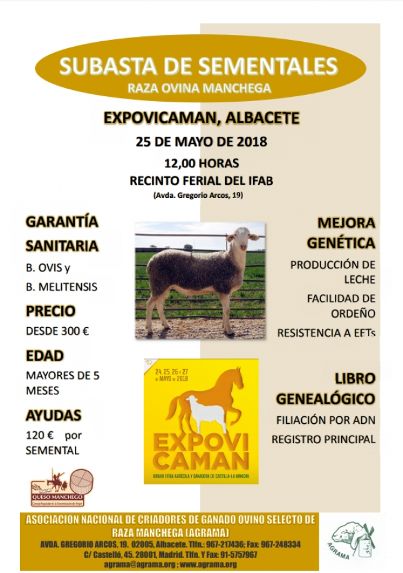 La Asociación Nacional de Criadores de Ganado Ovino Selecto de Raza Manchega (AGRAMA) celebrará una Subasta de Sementales de la raza el próximo viernes 25 de mayo en el marco de la XXXVIII Feria Agrícola y Ganadera de Castilla-La Mancha EXPOVICAMAN, evento que se llevará a cabo del 24 al 27 de mayo en Albacete.