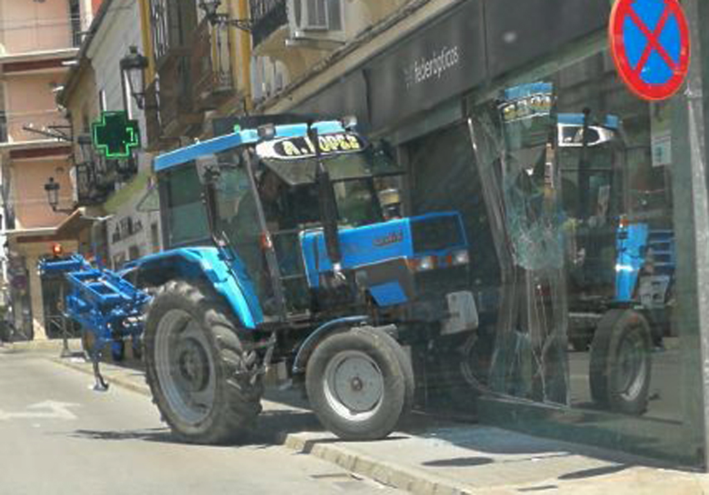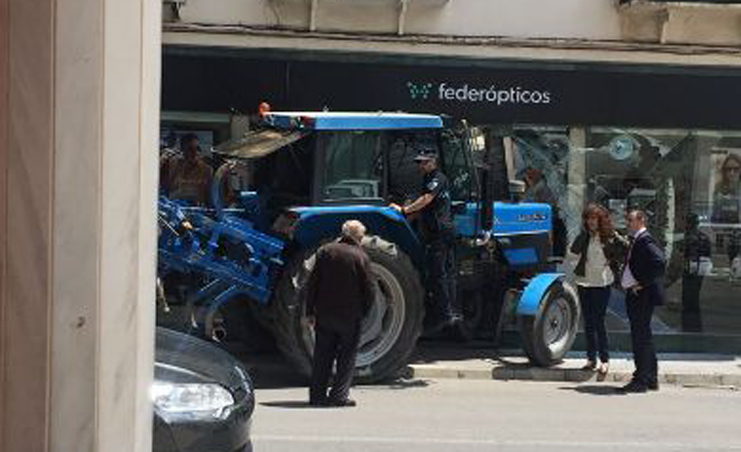 Un tractor de color azul, marca Landini, se ha empotrado sobre las tres de la tarde de este martes contra el escaparate de Federópticos Vega, en la calle Socuéllamos de Tomelloso, junto a la Plaza de España de Tomelloso, que en esos momentos se encontraba cerrado al público.