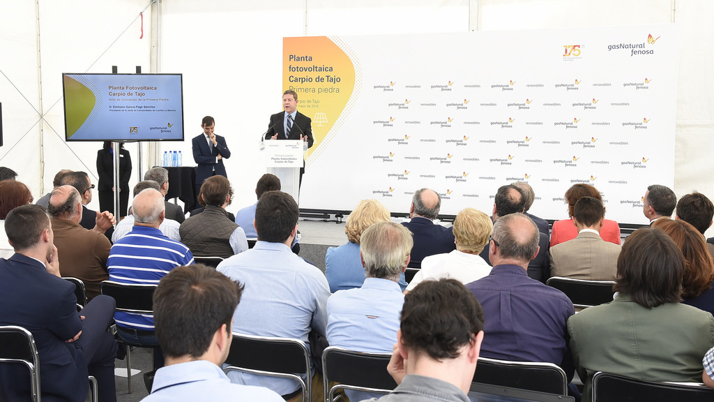 Así lo ha adelantado el presidente del Ejecutivo autonómico durante el acto de colocación de la primera piedra de la nueva planta solar fotovoltaica que Gas Natural Fenosa Renovables va a desarrollar en la localidad toledana de El Carpio de Tajo; un acto en el que, entre otros, también han participado la consejera de Economía, Empresas y Empleo, Patricia Franco; la directora general de Gas Natural Fenosa Renovables, Ana Peris; el delegado territorial de la compañía en Castilla-La Mancha, David Muñoz; el director general de negocios mayoristas de energía de Gas Natural Fenosa, Manuel Fernández Álvarez; el presidente de la Diputación provincial de Toledo, Álvaro Gutiérrez; y el alcalde de El Carpio de Tajo, Germán Jiménez Marcos.