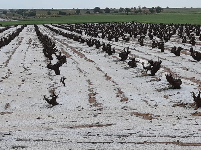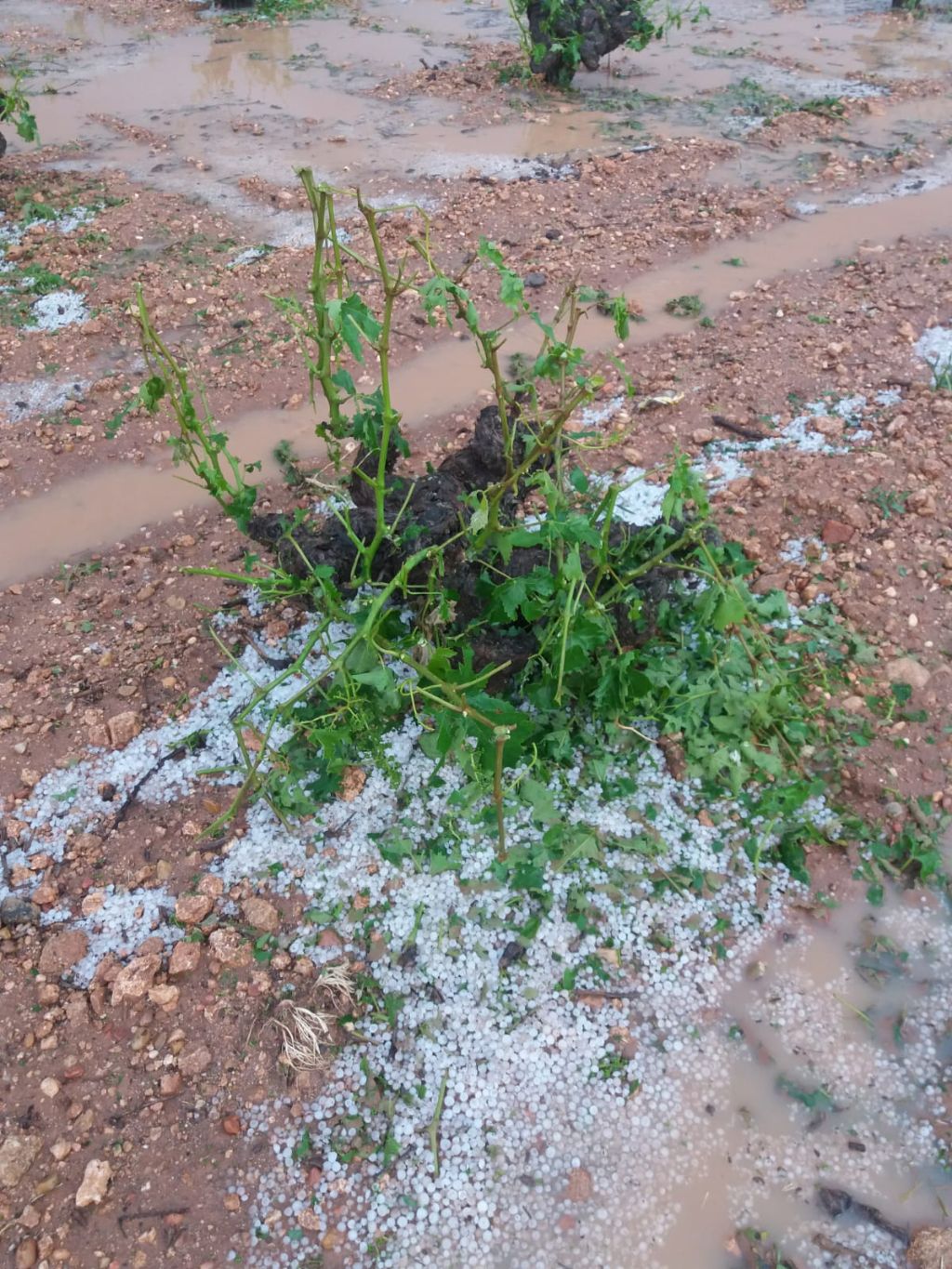 Una fuerte tormenta de granizo ha causado daños en numerosas hectáreas de viñedo de varias zonas de Castilla-La Mancha, entre ellas, Socuéllamos y Tomelloso, en la provincia de Ciudad Real y Santa Cruz de la Zarza, Madridejos y Consuegra, en la de Toledo. Además, a primera hora de la tarde de este martes, volvía a llover torrencialmente en localidades como Valdepeñas y Moral de Calatrava, inundando parcelas de viñedo y olivar, principalmente. Y en la provincia de Albacete también ha llovido abundantemente en las localidades de Balazote, Lezuza y Hellín. En esta provincia los daños se suman a los de localidades como La Gineta o Pozohondo, con parcelas de viña, olivar, cereales, leguminosas y almendro afectadas. Más de 1.000, según las primeras estimaciones de ASAJA Albacete.