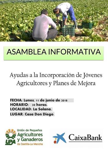 La Unión de Pequeños Agricultores y Ganaderos, UPA, de Castilla-La Mancha ofrecerá el lunes 11 de junio en La Solana (Ciudad Real) una asamblea informativa sobre las ayudas a la Incorporación de jóvenes agricultores y planes de mejora, que se desarrollarán en diversos puntos de la región, con el patrocinio de Caixabank.