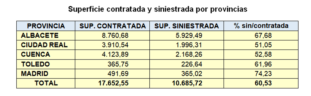 Hasta la fecha, la superficie siniestrada total de este cultivo alcanza las 10.685 hectáreas, un 60% de la superficie total contratada (17.652 ha). Albacete es la provincia que registra la mayor superficie siniestrada (5.929 ha, un 68% de la superficie contratada), seguido de Cuenca (2.168 ha) y Ciudad Real (1.996 ha).