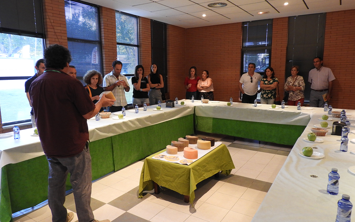 El técnico catador de quesos manchegos y biólogo, Juan Luis Parejo, enseña a 25 personas a analizar y juzgar las características organolépticas de este producto; la corteza, el color de la pasta, la textura, elasticidad o solubilidad, entre otros matices, son algunas de las claves a tener en cuenta a la hora de catar un queso, que junto a la valoración de su aroma y sabor conforman todo un ritual de cata que se desarrolla durante estos días en la Feria Nacional del Campo.