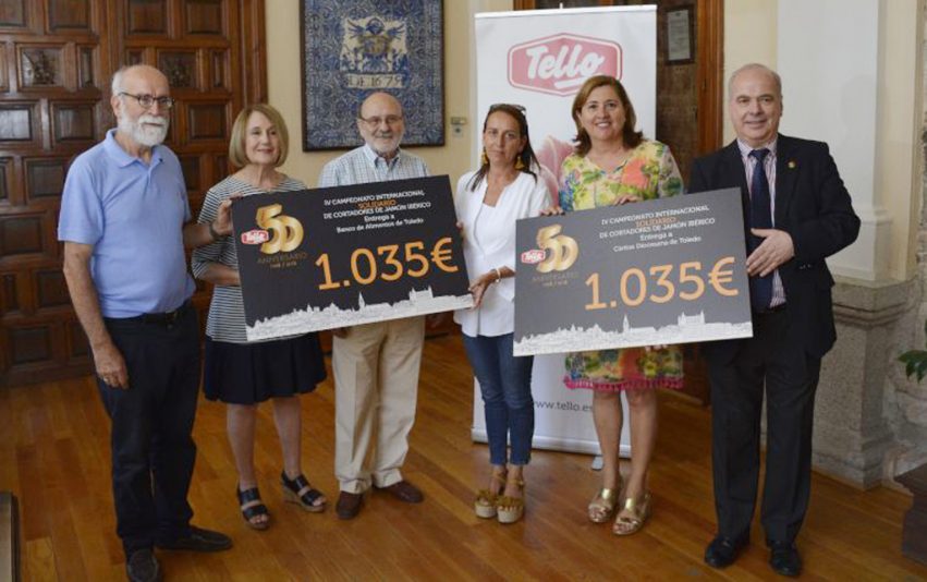 El Consistorio toledano ha acogido este lunes la entrega de los cheques solidarios de la cuarta edición del Campeonato Internacional Solidario de Cortadores de Jamón Ibérico organizado por el Grupo Tello Alimentación en colaboración con el Ayuntamiento, y que un año más han recaído en dos organizaciones toledanas que trabajan por los más necesitados, Cáritas y el Banco de Alimentos.